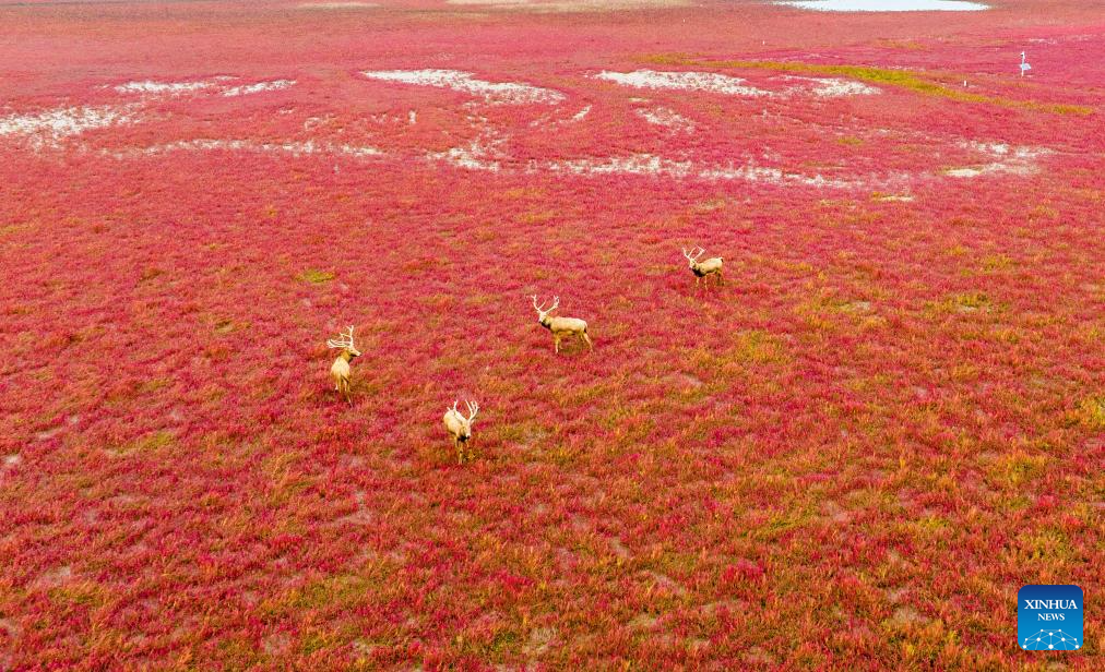 An aerial drone photo taken on Oct. 16, 2024 shows elks wandering at the Tiaozini wetland in Dongtai City, east China's Jiangsu Province. (Photo by Sun Jialu/Xinhua)