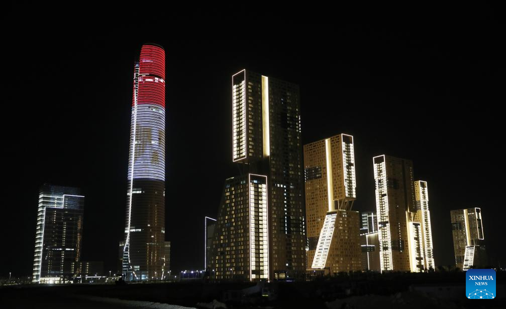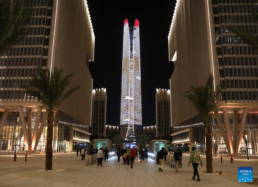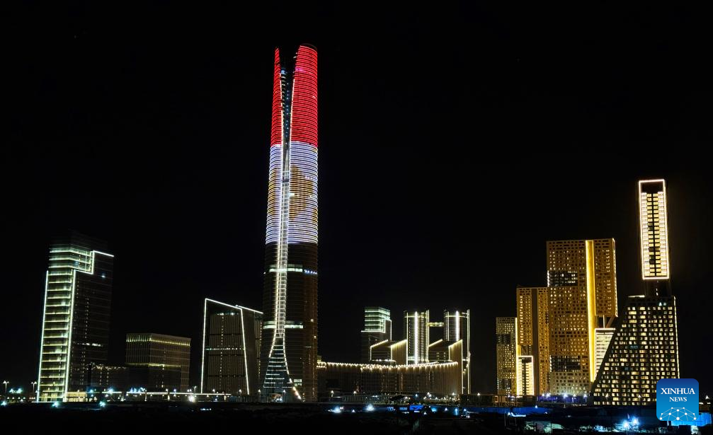 This photo taken on Oct. 21, 2024 shows a night view of the Central Business District (CBD) of Egypt's new administrative capital, east of Cairo, Egypt. (Xinhua/Wang Dongzhen)