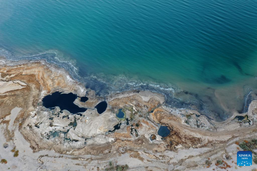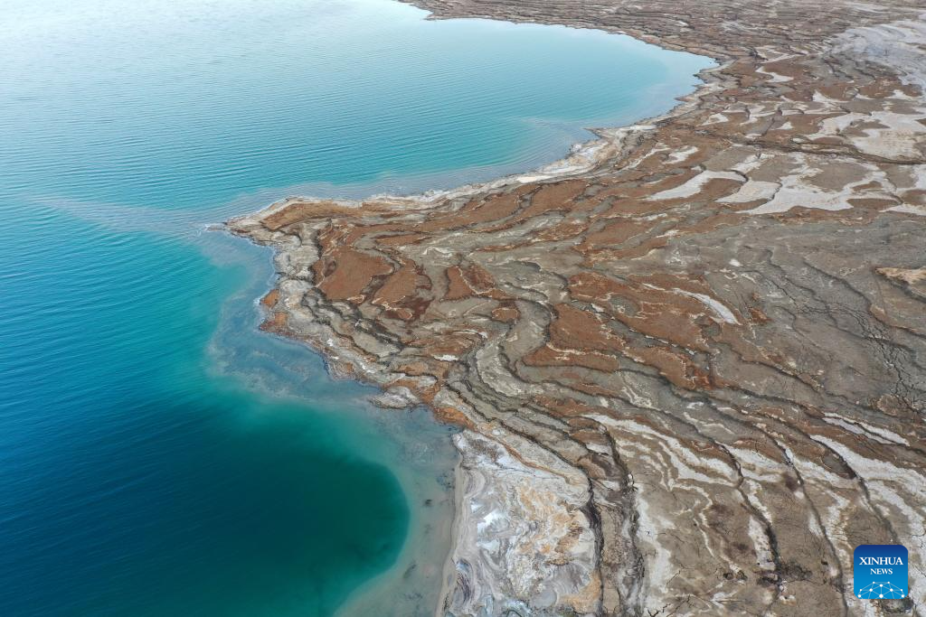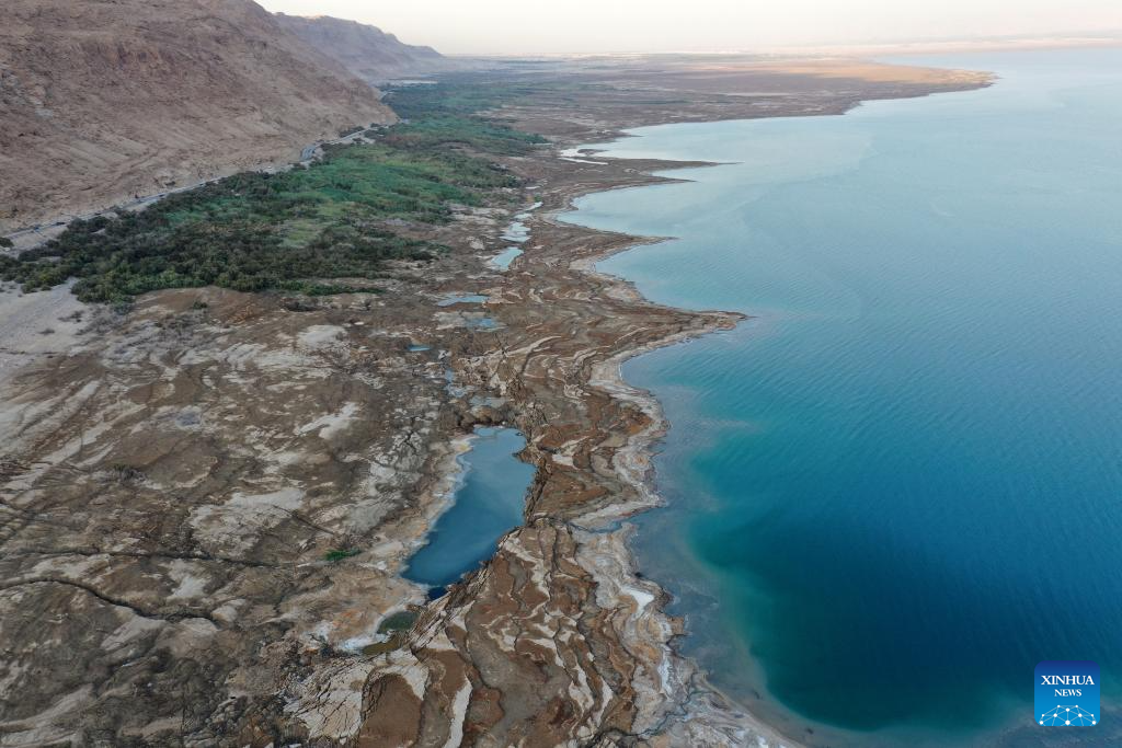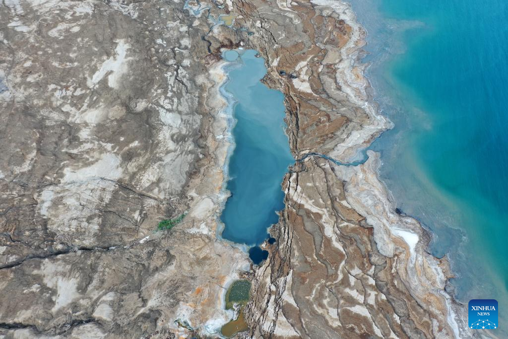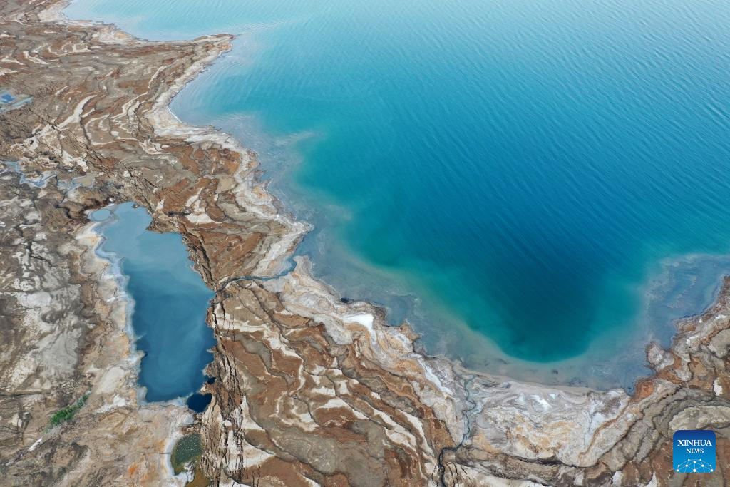 An aerial drone photo taken on Oct. 22, 2024 shows a view of the Dead Sea near Ein Gedi beach in Israel. (Photo by Gil Cohen Magen/Xinhua)