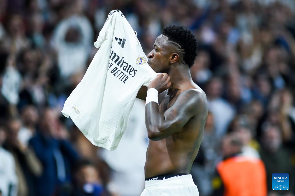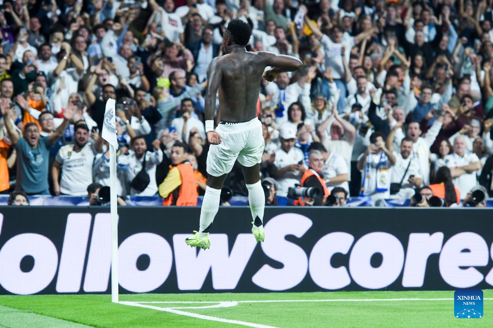 Vinicius Junior of Real Madrid celebrates his goal during the third round match of UEFA Champions League between Real Madrid and Borussia Dortmund in Santiago Bernabeu stadium, Madrid, Spain, Oct. 22, 2024. (Photo by Gustavo Valiente/Xinhua)