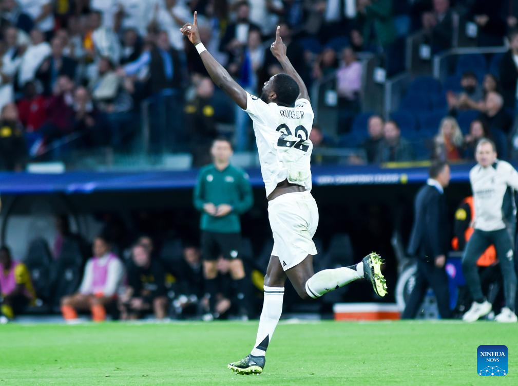 Antonio Rudiger of Real Madrid celebrates his goal during the third round match of UEFA Champions League between Real Madrid and Borussia Dortmund in Santiago Bernabeu stadium, Madrid, Spain, Oct. 22, 2024. (Photo by Gustavo Valiente/Xinhua)