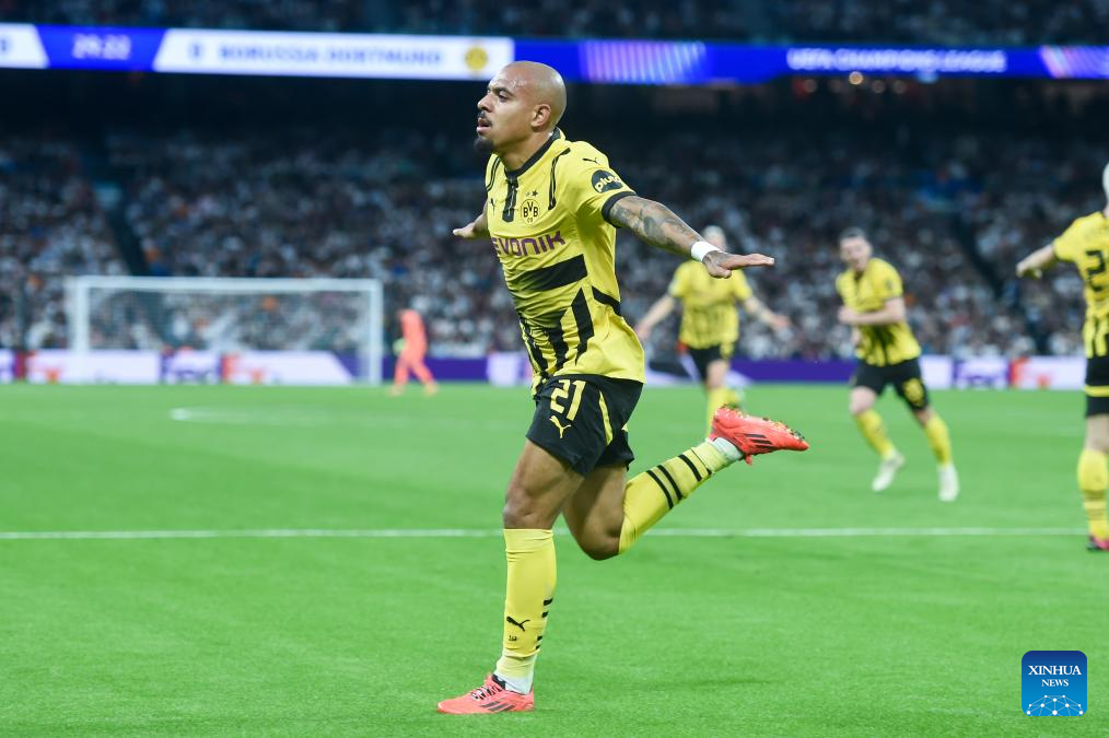 Donyell Malen of Borussia Dortmund celebrates his goal during the third round match of UEFA Champions League between Real Madrid and Borussia Dortmund in Santiago Bernabeu stadium, Madrid, Spain, Oct. 22, 2024. (Photo by Gustavo Valiente/Xinhua)