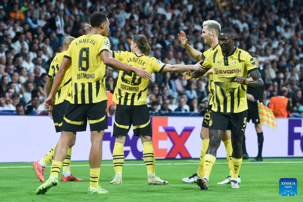 Players of Borussia Dortmund celebrate a goal during the third round match of UEFA Champions League between Real Madrid and Borussia Dortmund in Santiago Bernabeu stadium, Madrid, Spain, Oct. 22, 2024. (Photo by Gustavo Valiente/Xinhua)