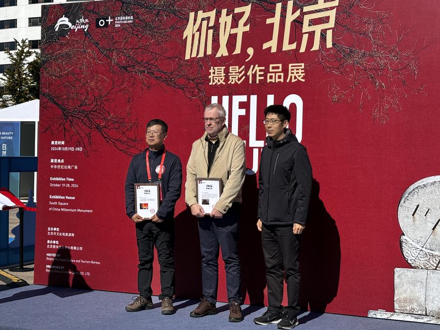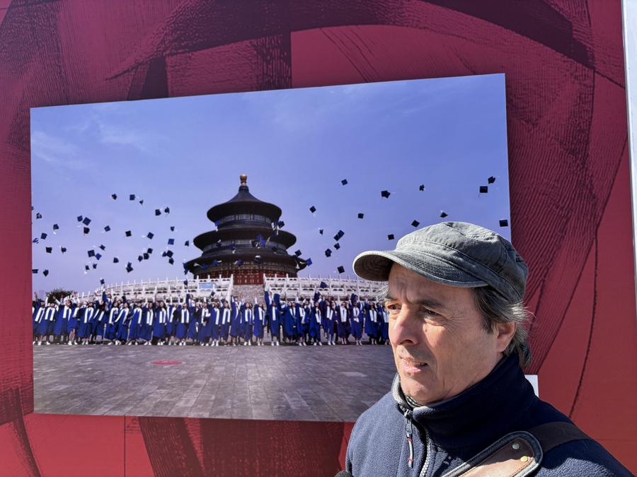 BEIJING, Oct. 24 (Xinhua) -- Standing in front of a giant photograph, George Doupas introduced his work "Happy Graduation" to a visitor. In the image, a group of university graduates in gowns throw their trencher caps into the sky, with the Temple of Heaven, one of Beijing's architectural landmarks, in the background.