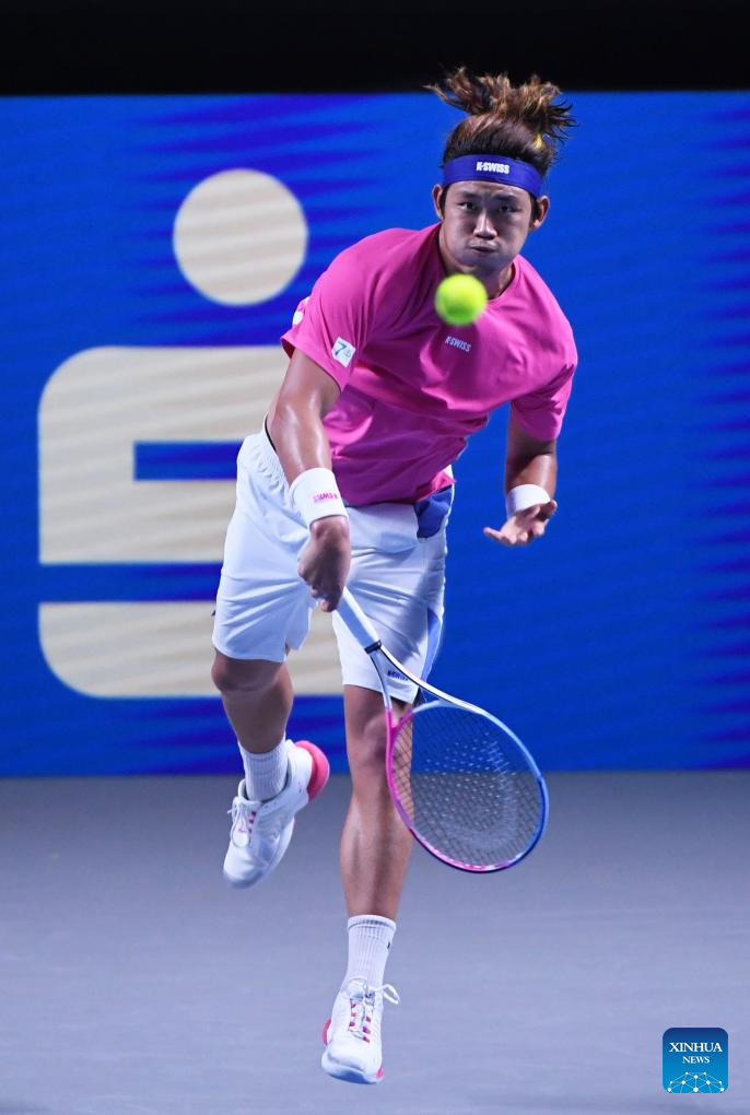 Zhang Zhizhen serves during the men's singles 1st round match between Zhang Zhizhen of China and Grigor Dimitrov of Bulgaria at Erste Bank Tennis Open in Vienna, Austria, Oct. 23, 2024. (Xinhua/He Canling)