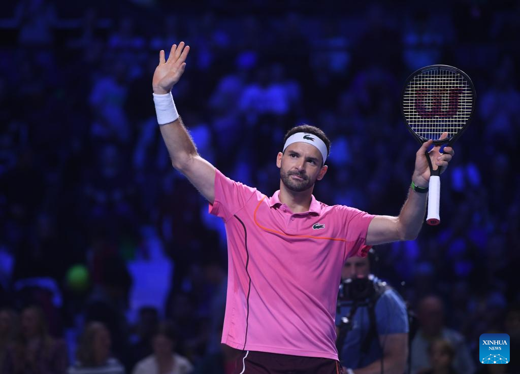Grigor Dimitrov celebrates after winning the men's singles 1st round match between Zhang Zhizhen of China and Grigor Dimitrov of Bulgaria at Erste Bank Tennis Open in Vienna, Austria, Oct. 23, 2024. (Xinhua/He Canling)