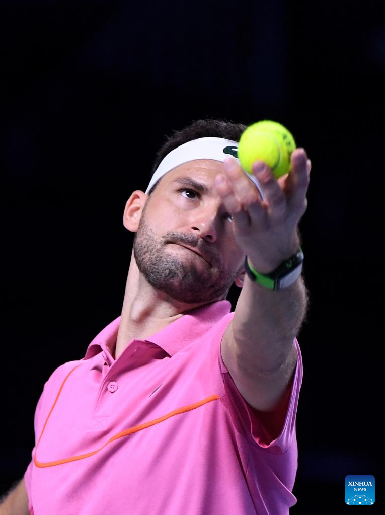 Grigor Dimitrov serves during the men's singles 1st round match between Zhang Zhizhen of China and Grigor Dimitrov of Bulgaria at Erste Bank Tennis Open in Vienna, Austria, Oct. 23, 2024. (Xinhua/He Canling)