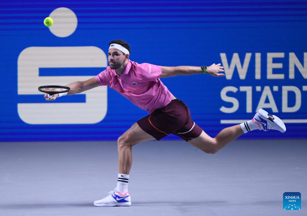 Grigor Dimitrov hits a return during the men's singles 1st round match between Zhang Zhizhen of China and Grigor Dimitrov of Bulgaria at Erste Bank Tennis Open in Vienna, Austria, Oct. 23, 2024. (Xinhua/He Canling)