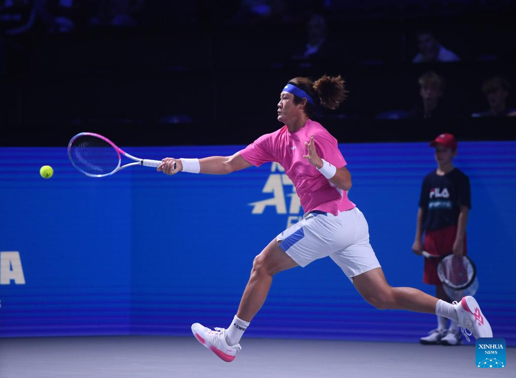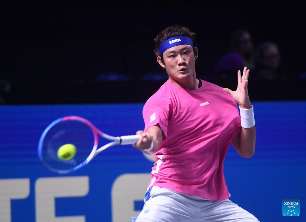 Zhang Zhizhen hits a return during the men's singles 1st round match between Zhang Zhizhen of China and Grigor Dimitrov of Bulgaria at Erste Bank Tennis Open in Vienna, Austria, Oct. 23, 2024. (Xinhua/He Canling)