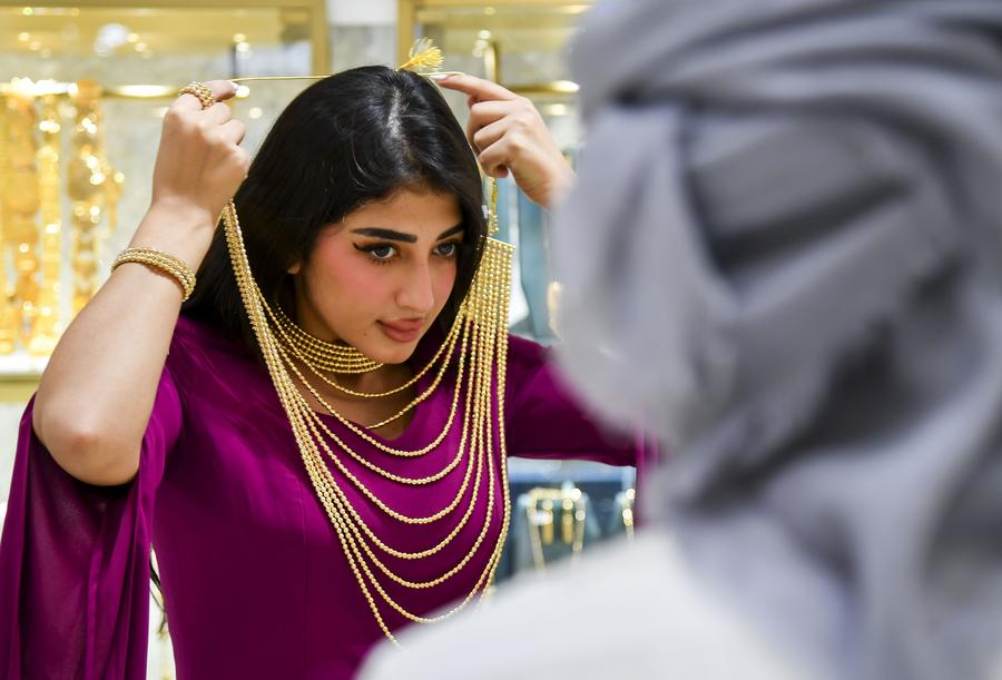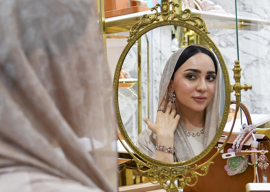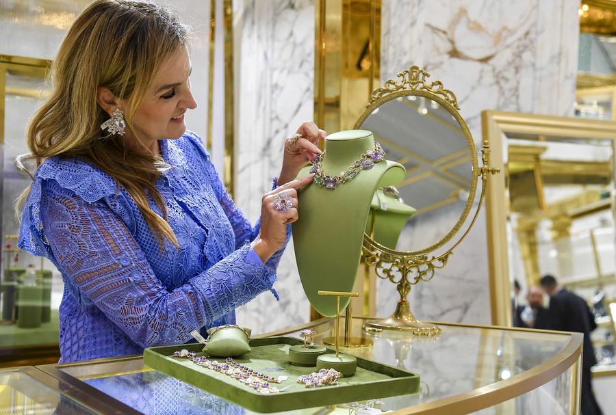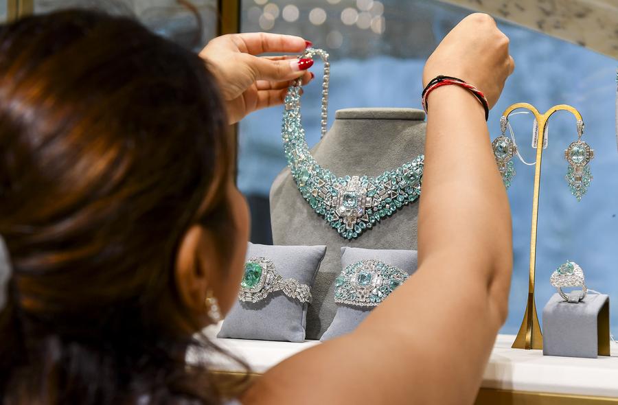A woman arranges jewelry at a stall during the ASJAD Jewelry Exhibition at Alhazm Mall in Doha, Qatar, Oct. 24, 2024. (Photo by Nikku/Xinhua)A woman arranges jewelry at a stall during the ASJAD Jewelry Exhibition at Alhazm Mall in Doha, Qatar, Oct. 24, 2024. (Photo by Nikku/Xinhua)A woman tries handcrafted jewelry at a stall during the ASJAD Jewelry Exhibition at Alhazm Mall in Doha, Qatar, Oct. 24, 2024. (Photo by Nikku/Xinhua)■