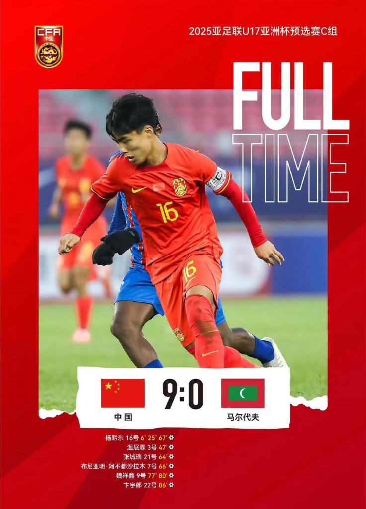 Following victories over Bahrain and Bhutan, China achieved a three-match winning streak in their AFC U-17 Asian Cup qualifying campaign with a 9-0 thrashing of the Maldives in Group C on October 25, with captain Yang Qiandong notching a hat-trick.
