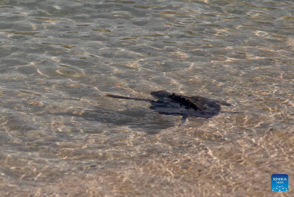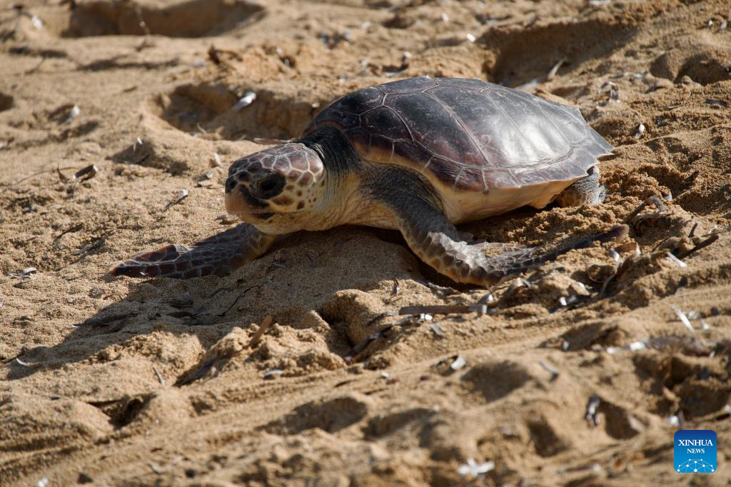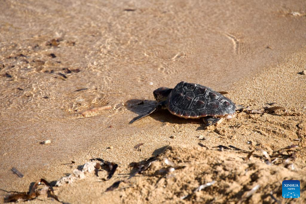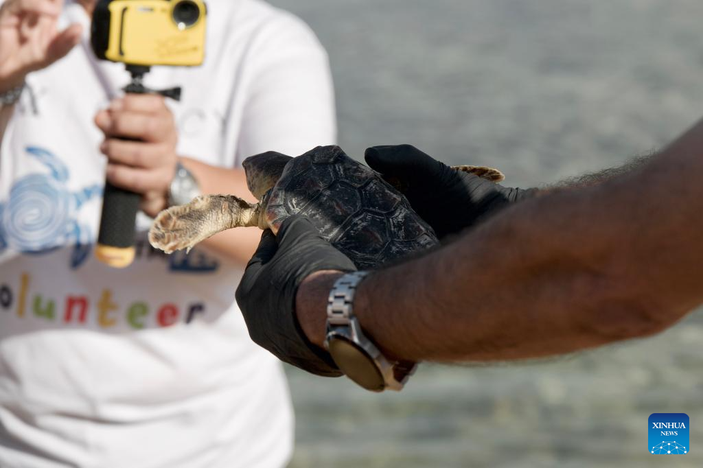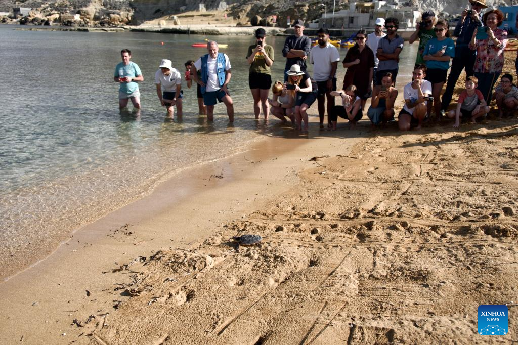 A turtle is released into the sea at the Gnejna Bay in Mgarr, Malta, on Oct. 25, 2024. Three loggerhead turtles were released back into the sea at the Gnejna Bay on Friday. (Photo by Jonathan Borg/Xinhua)