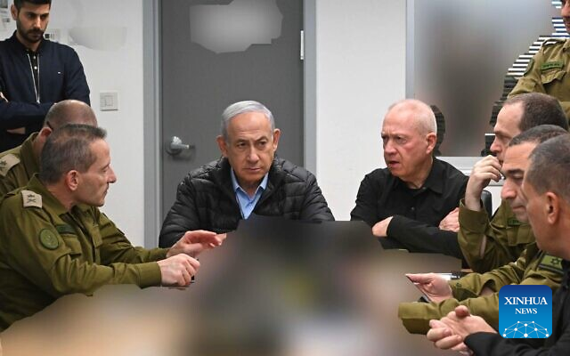 This photo released on Oct. 26, 2024 shows Israeli Prime Minister Benjamin Netanyahu (C, L), Israeli Defense Minister Yoav Gallant (C, R) and other senior military officers gather at the headquarters of the Israel Defense Forces in Tel Aviv, Israel. A number of strong explosions were heard in the Iranian capital Tehran in the early hours of Saturday, state-run IRIB TV reported. Israel confirmed that it had launched "precise strikes on military targets in Iran" early Saturday morning local time. The Israel Defense Forces said the strikes were in response to "months of continuous attacks" from Iran. (Israel's Government Press Office/Handout via Xinhua)