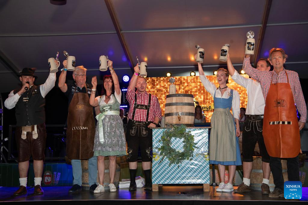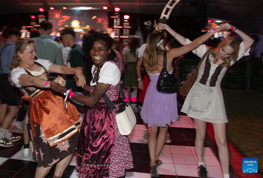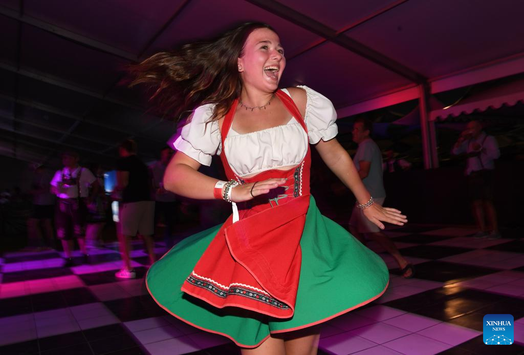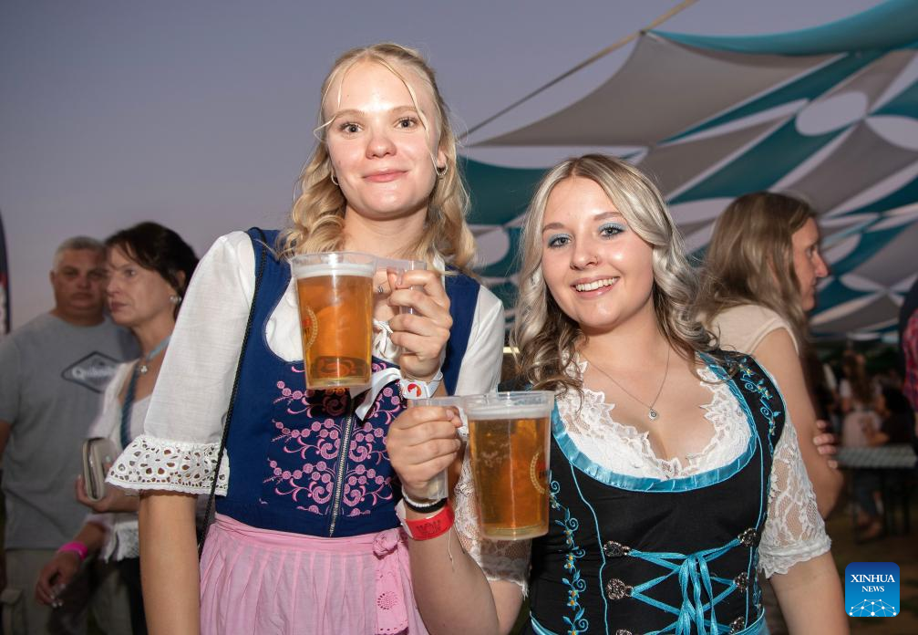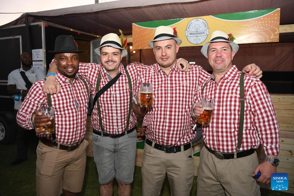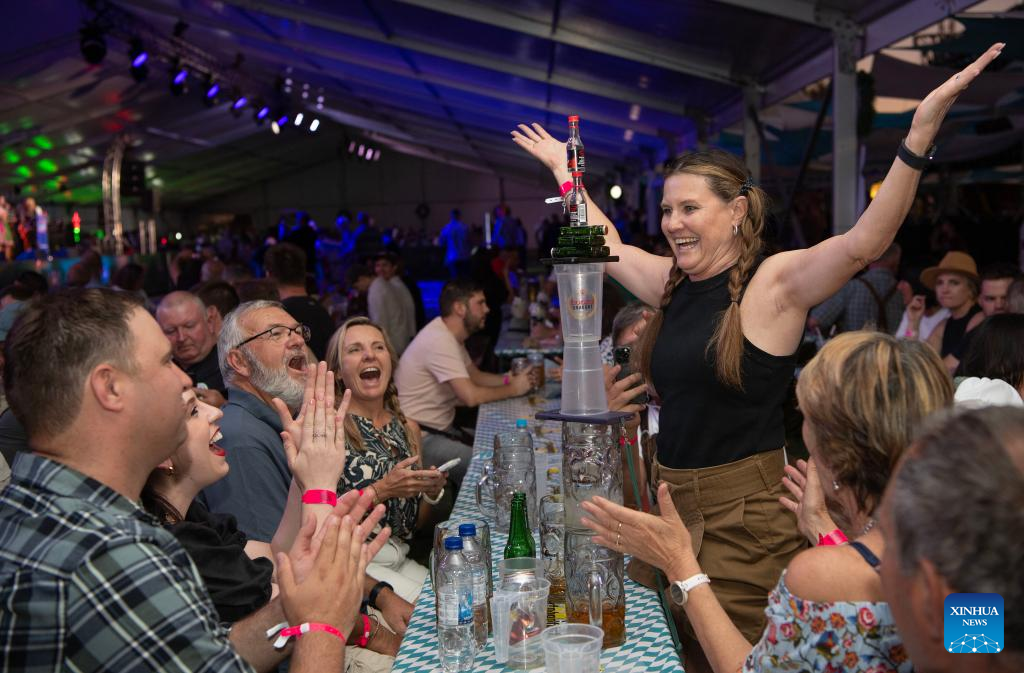 Guests celebrate the opening of the Windhoek Oktoberfest in Windhoek, Namibia, Oct. 25, 2024. The 64th edition of the Windhoek Oktoberfest kicked off on Friday in the Namibian capital of Windhoek. (Xinhua/Chen Cheng)