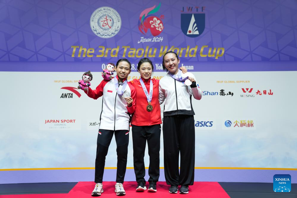 Wu Jianing (C) of China , Tasya Ayu Puspa Dewi (L) of Indonesia and Lucy Ruxi Lee of the Unites States pose for photos during the awarding ceremony of the Women's Nandao competition of the 3rd Taolu World Cup held in Yokohama, Japan, on Oct. 26, 2024. (Xinhua/Zhang Xiaoyu)