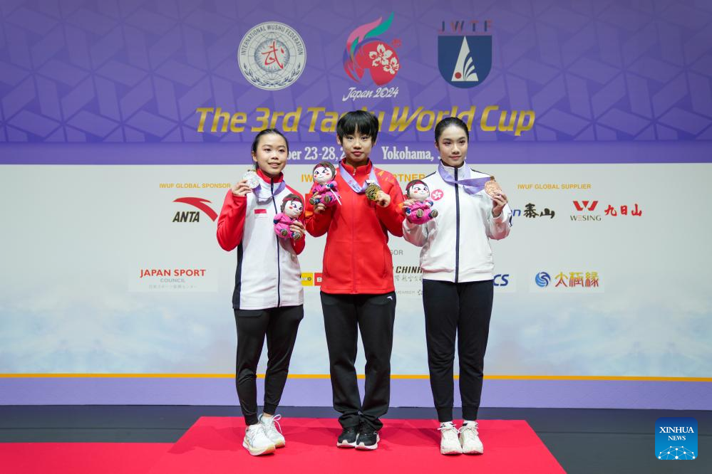 Gold medalist Liu Xin(C) of China, silver medalist Eugenia Diva Widodo (L) of Indonesia and bronze medalist Michelle Yeung of China's Hong Kong pose for photos during the awarding ceremony for the Women's Daoshu competition of the 3rd Taolu World Cup held in Yokohama, Japan, on Oct. 27, 2024. (Xinhua/Zhang Xiaoyu)