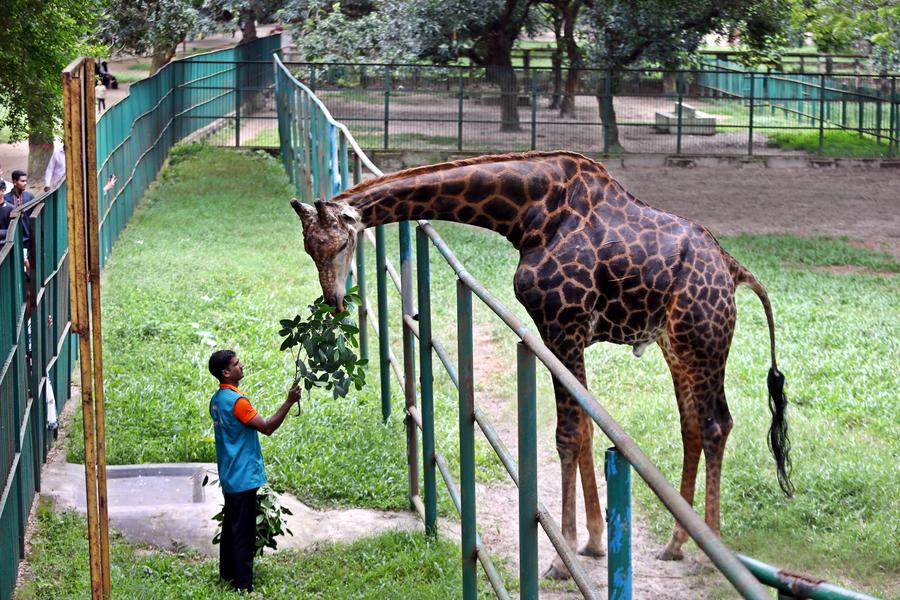 A staff member feeds a giraffe in the Bangladesh National Zoo in the Mirpur section of Dhaka, Bangladesh, Oct. 24, 2024. (Xinhua)