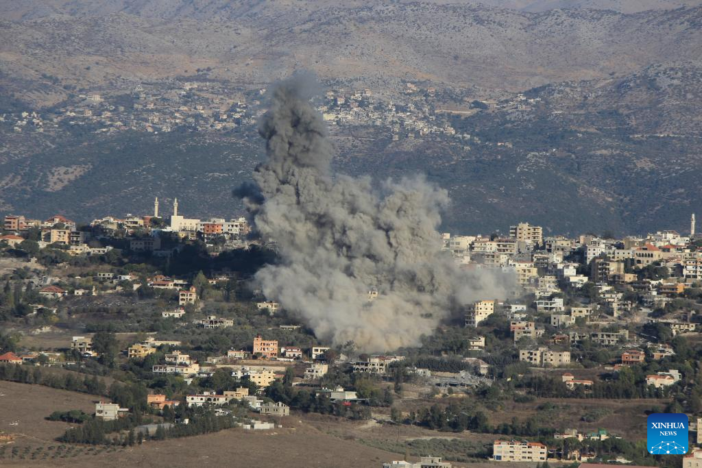This photo shows the smoke caused by Israeli airstrikes in Kfar Remen, Lebanon, on Oct. 25, 2024. According to a report on Saturday by the Lebanese Council of Ministers, 76 airstrikes and shelling were recorded in various areas of Lebanon over the past 24 hours, concentrated in the South and Nabatieh governorates. (Photo by Taher Abu Hamdan/Xinhua)