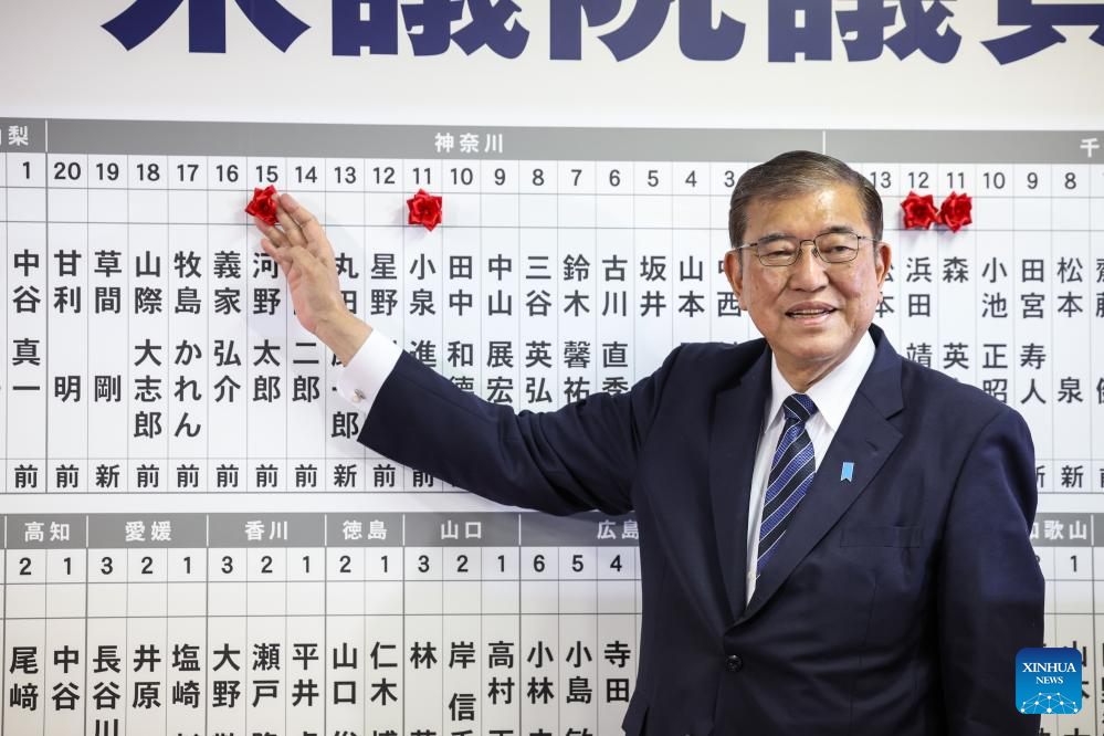 Japan's Prime Minister and leader of the Liberal Democratic Party (LDP) Shigeru Ishiba places a pin above the name of a candidate at the LDP headquarters in Tokyo, Japan, Oct. 27, 2024. Voting for Japan's lower house election began on Sunday morning amid public discontent over the ruling LDP's slush funds scandal and a rising cost of living that squeezes Japanese households. (Takashi Aoyama/Pool via Xinhua)