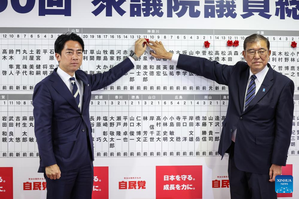 Japan's Prime Minister and leader of the Liberal Democratic Party (LDP) Shigeru Ishiba (R) and former environment minister Shinjiro Koizumi place a pin on a board showing candidates' names at the LDP headquarters in Tokyo, Japan, Oct. 27, 2024. Voting for Japan's lower house election began on Sunday morning amid public discontent over the ruling LDP's slush funds scandal and a rising cost of living that squeezes Japanese households. (Takashi Aoyama/Pool via Xinhua)