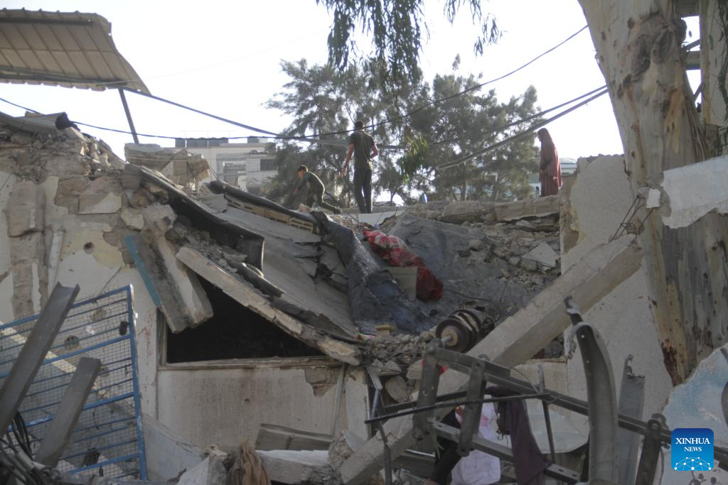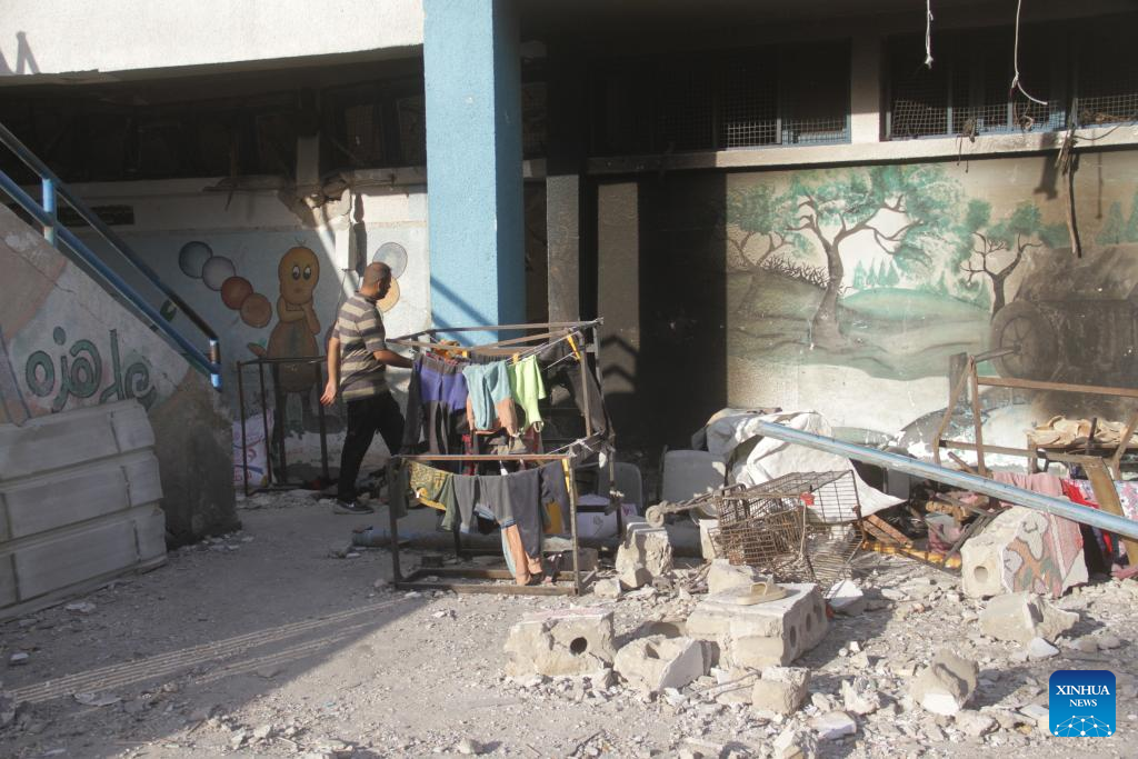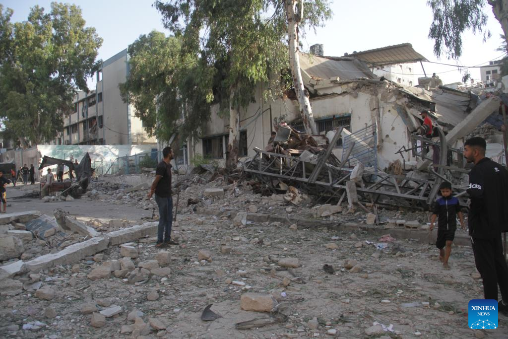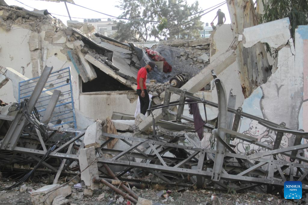 People check a school sheltering displaced people after it was destroyed by Israeli airstrike, at the al-Shati refugee camp, west of Gaza City, on Oct. 27, 2024. Nine Palestinians, including three journalists, were killed on Sunday in an Israeli airstrike targeting a school sheltering displaced persons in the al-Shati refugee camp west of Gaza City, according to Palestinian sources. (Photo by Mahmoud Zaki/Xinhua)