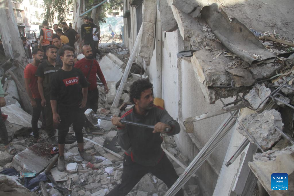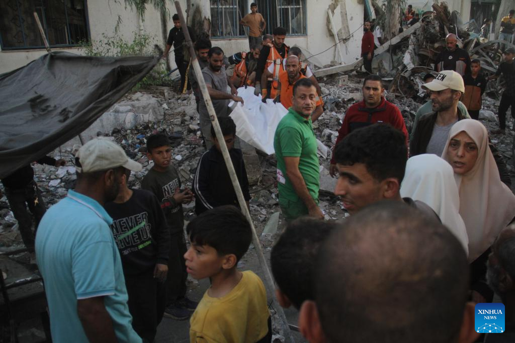 GAZA, Oct. 27 (Xinhua) -- Nine Palestinians, including three journalists, were killed on Sunday in an Israeli airstrike targeting a school sheltering displaced persons in the al-Shati refugee camp west of Gaza City, according to Palestinian sources.
