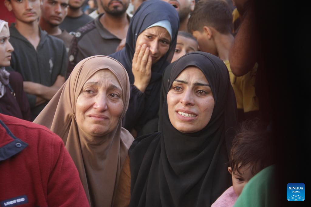 People mourn victims at a school sheltering displaced people after it was destroyed by Israeli airstrike, at the al-Shati refugee camp, west of Gaza City, on Oct. 27, 2024. Nine Palestinians, including three journalists, were killed on Sunday in an Israeli airstrike targeting a school sheltering displaced persons in the al-Shati refugee camp west of Gaza City, according to Palestinian sources. (Photo by Mahmoud Zaki/Xinhua)