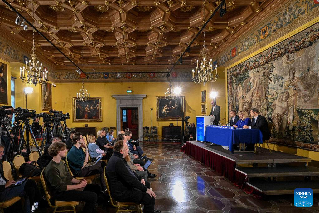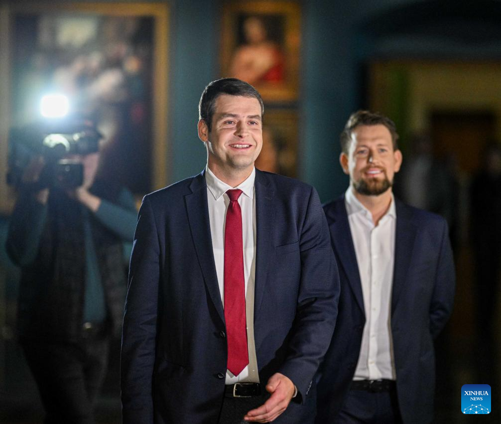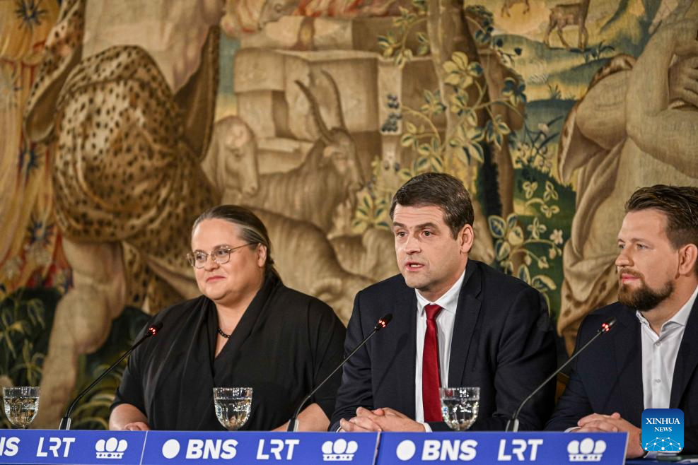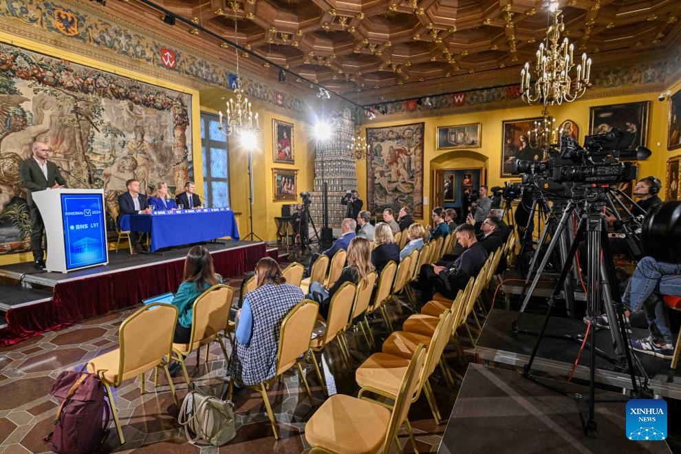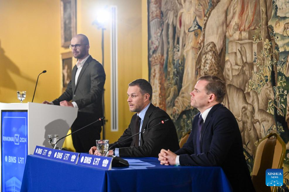 Lithuanian Foreign Minister Gabrielius Landsbergis (C), chairman of the ruling Homeland Union-Lithuanian Christian Democrats (TS-LKD), attends a press conference in Vilnius, Lithuania, Oct. 28, 2024. Lithuania's opposition Social Democratic Party (LSDP) won parliamentary election runoff on Sunday, according to preliminary results of the Central Electoral Commission. (Photo by Alfredas Pliadis/Xinhua)