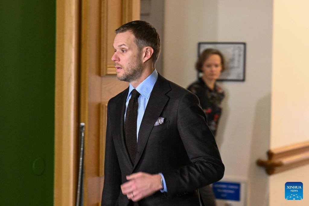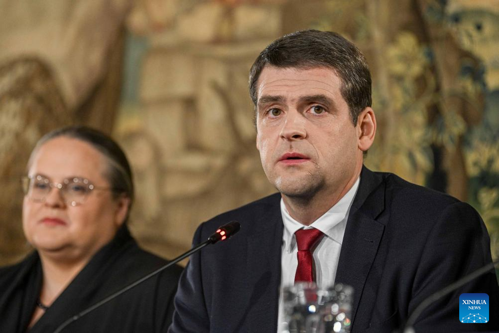 Lithuanian Foreign Minister Gabrielius Landsbergis, chairman of the ruling Homeland Union-Lithuanian Christian Democrats (TS-LKD), attends a press conference in Vilnius, Lithuania, Oct. 28, 2024. Lithuania's opposition Social Democratic Party (LSDP) won parliamentary election runoff on Sunday, according to preliminary results of the Central Electoral Commission. (Photo by Alfredas Pliadis/Xinhua)