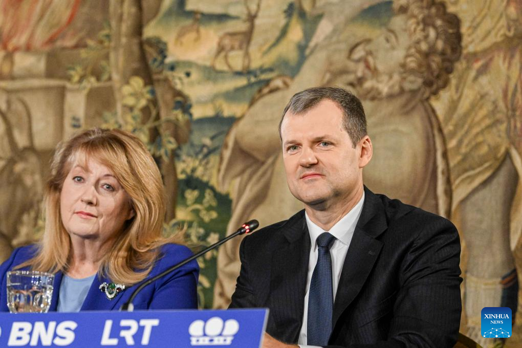 Remigijus Zemaitaitis (R), leader of the Dawn of the Nemunas (Nemuno Ausra), attends a press conference in Vilnius, Lithuania, Oct. 28, 2024. Lithuania's opposition Social Democratic Party (LSDP) won parliamentary election runoff on Sunday, according to preliminary results of the Central Electoral Commission. (Photo by Alfredas Pliadis/Xinhua)