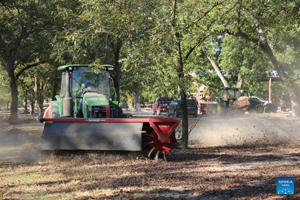 A driver rides a sweeper to collect pecans in an orchard in Rochelle, Georgia, the United States, on Oct. 25, 2024. (Xinhua/Liu Yanan)