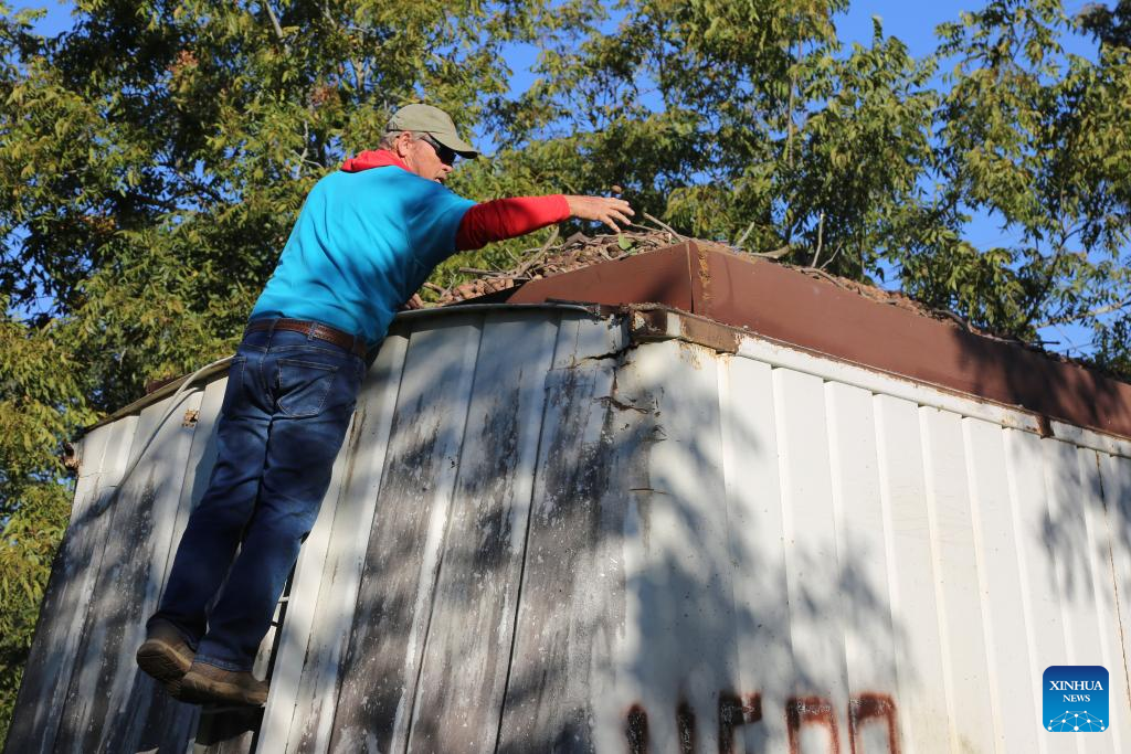 Randy Hudson, CEO of Hudson Pecan Company and former president of the U.S. Pecan Growers Council, takes care of pecans dumped into a truck in one of his orchards in Rochelle, Georgia, the United States, on Oct. 25, 2024. (Xinhua/Liu Yanan)