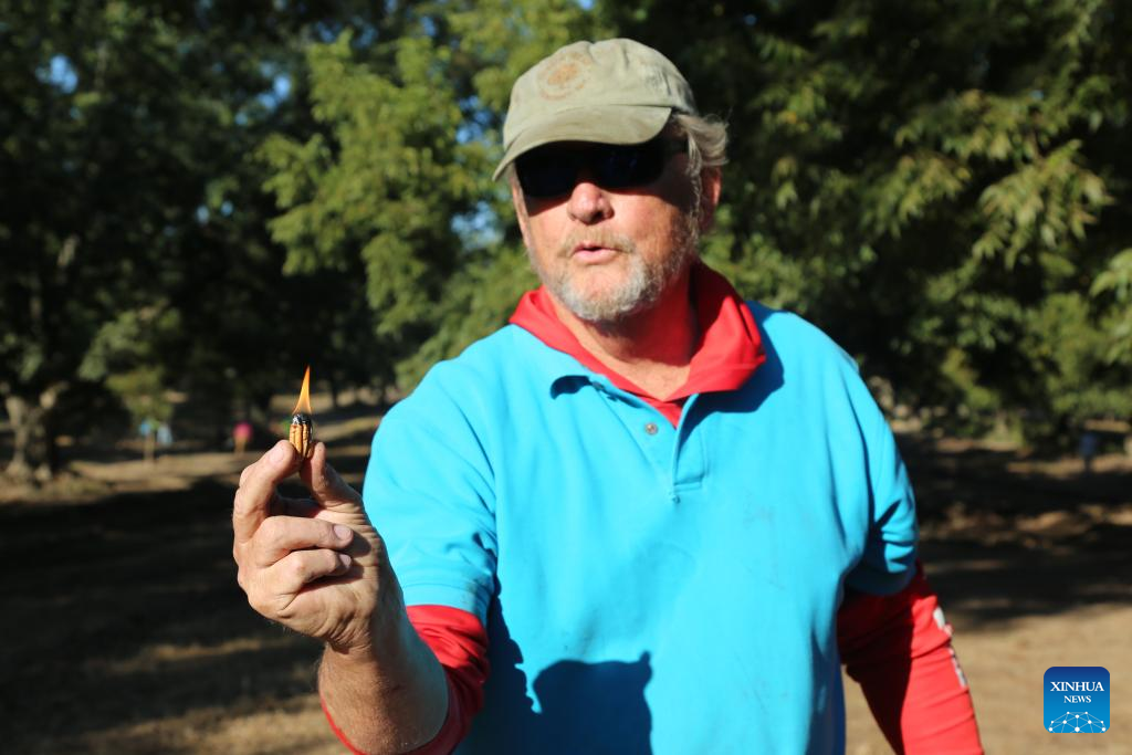 Randy Hudson, CEO of Hudson Pecan Company and former president of the U.S. Pecan Growers Council, kindles a fresh pecan flesh to demonstrate oil concentration in one of his orchards in Rochelle, Georgia, the United States, on Oct. 25, 2024. (Xinhua/Liu Yanan)