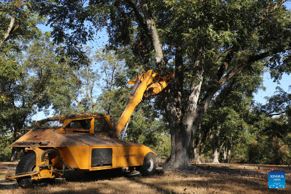 A driver rides a shaker to harvest pecans in an orchard in Rochelle, Georgia, the United States, on Oct. 25, 2024. (Xinhua/Liu Yanan)
