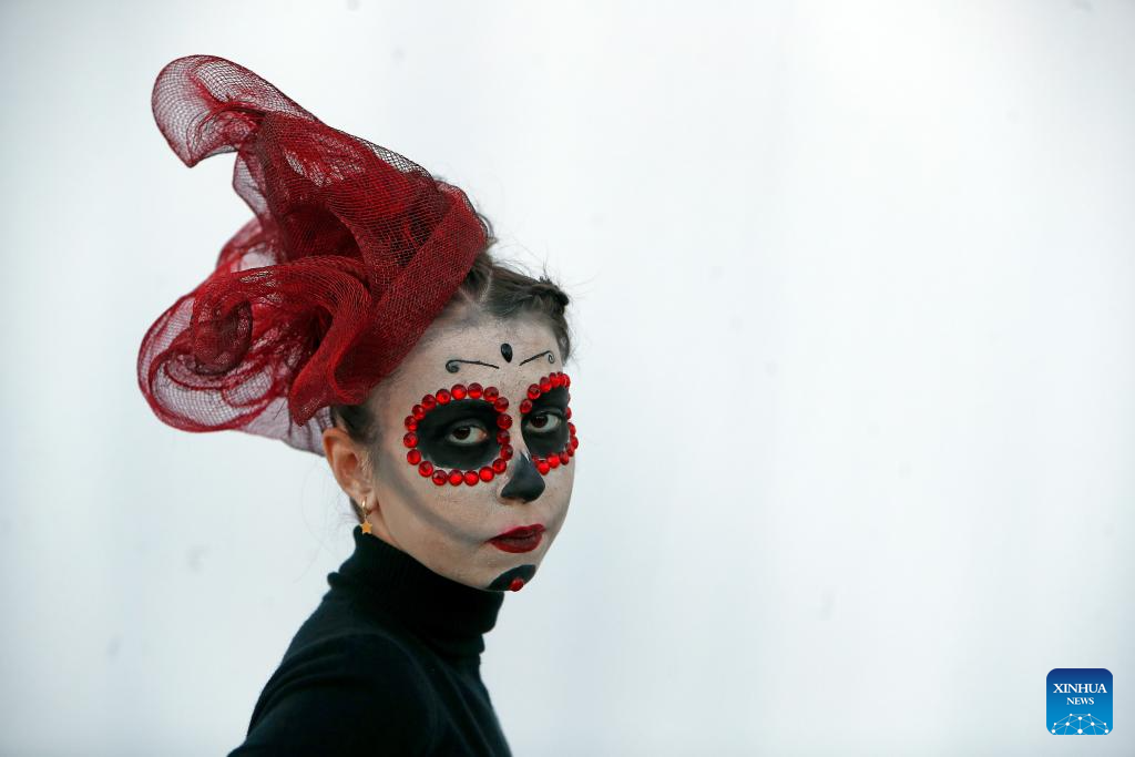 A costumed woman poses for photos at the West Side Hallo Fest, a Halloween festival in Bucharest, Romania, Oct. 26, 2024. (Photo by Cristian Cristel/Xinhua)