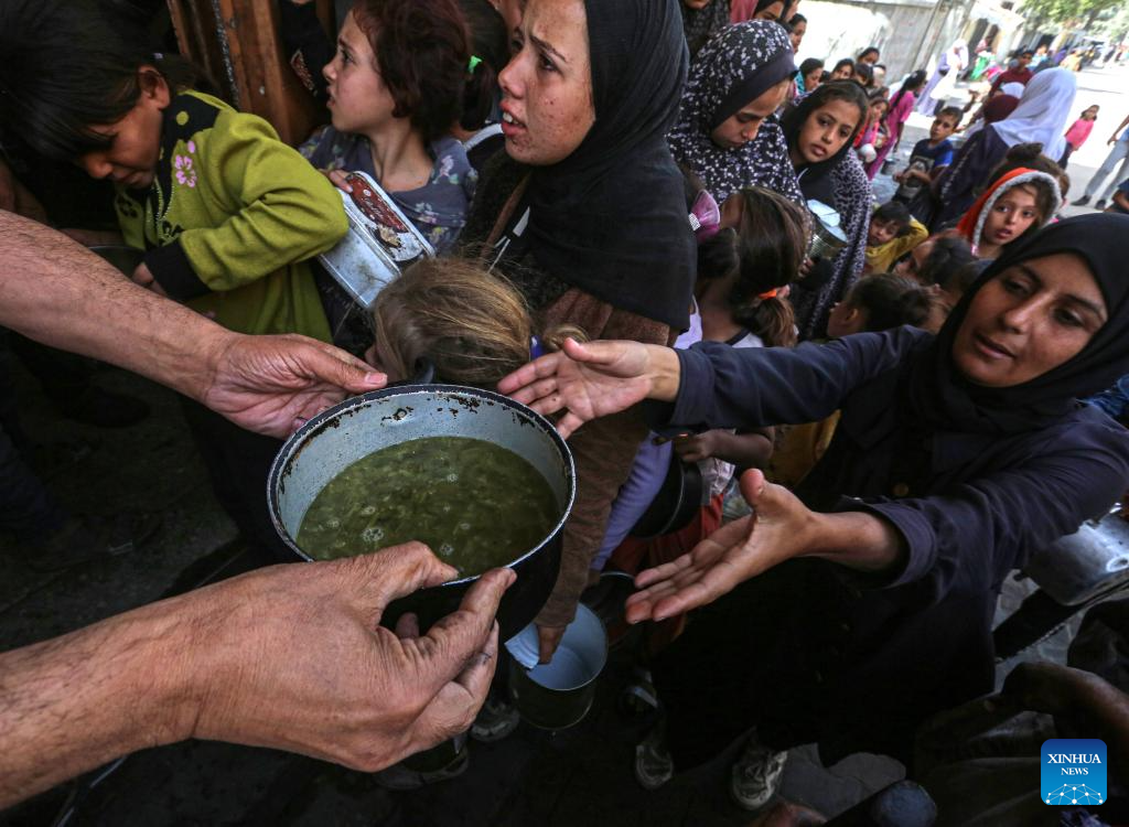 A Palestinian woman receives food at a food distribution center in the city of Deir al-Balah in central Gaza Strip, on Oct. 25, 2024. (Photo by Rizek Abdeljawad/Xinhua)