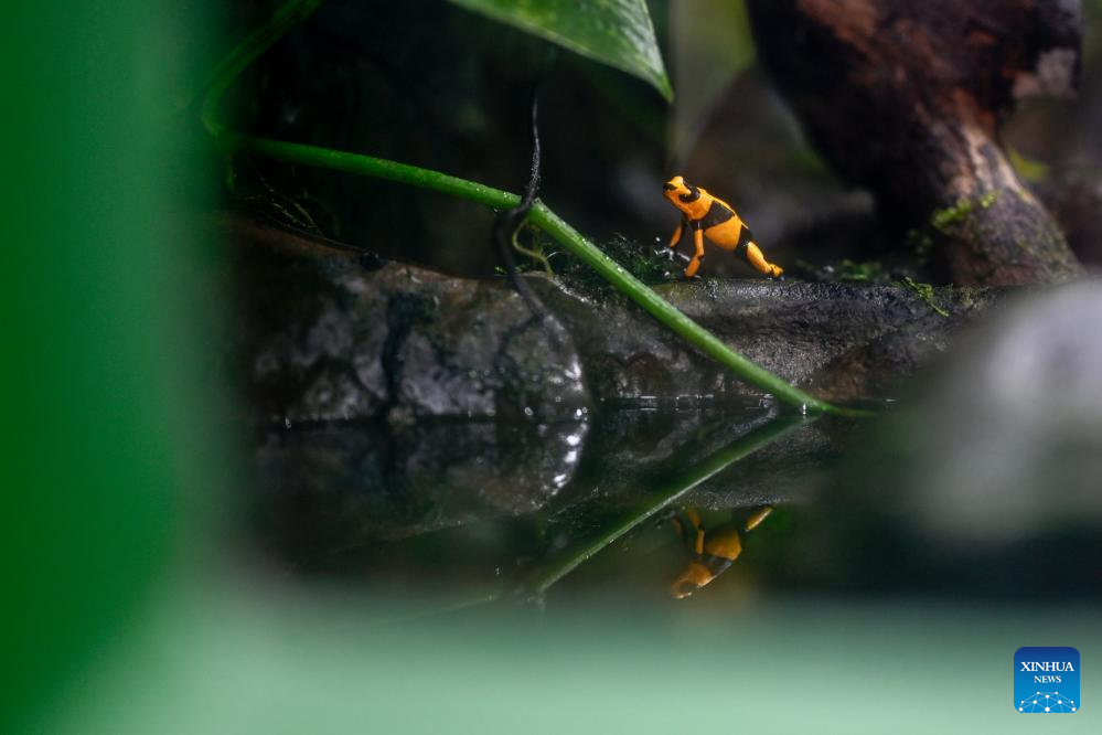 A poison dart frog is pictured at the Cali Zoo in Cali, Colombia, Oct. 24, 2024. (Xinhua/Li Muzi)