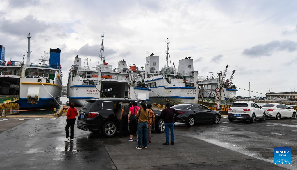 People and vehicles wait to board a ferry at the Xiuying Port in Haikou, south China's Hainan Province, Oct. 27, 2024. The Xinhai Port, Xiuying Port and a railway port in Haikou resumed operation on Oct. 27 afternoon as the impact of Typhoon Trami, this year's 20th typhoon, weakened. (Xinhua/Yang Guanyu)