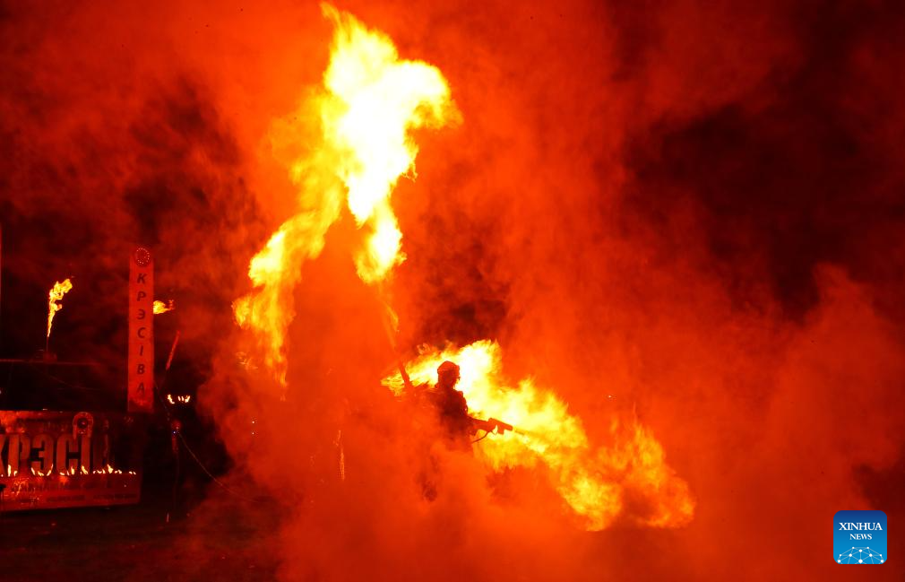An artist performs during a fire show at the botanical garden of Minsk, Belarus, Oct. 26, 2024. (Photo by Henadz Zhinkov/Xinhua)