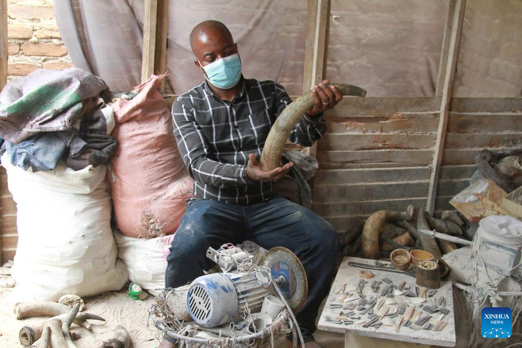 Joseph Chifamba checks a cow horn at his workshop in Marondera, Mashonaland East Province, Zimbabwe, on Oct. 28, 2024. (Photo by Tafara Mugwara/Xinhua)