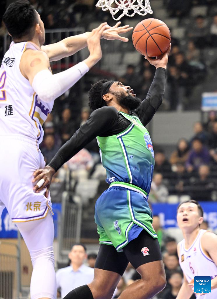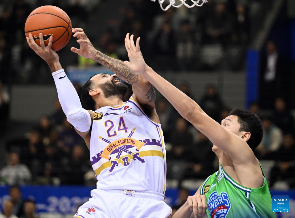 Grant Riller (L) of Beijing Royal Fighters goes for a basket during a match between Beijing Royal Fighters and Tianjin Pioneers at the 2024-2025 season of the Chinese Basketball Association (CBA) league in Tianjin, China, Oct. 29, 2024. (Xinhua/Zhao Zishuo)