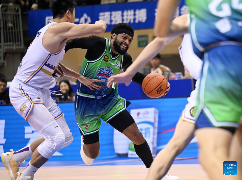 Marcus Lovett Jr. Javaughn of Tianjin Pioneers breaks through during a match between Beijing Royal Fighters and Tianjin Pioneers at the 2024-2025 season of the Chinese Basketball Association (CBA) league in Tianjin, China, Oct. 29, 2024. (Xinhua/Zhao Zishuo)