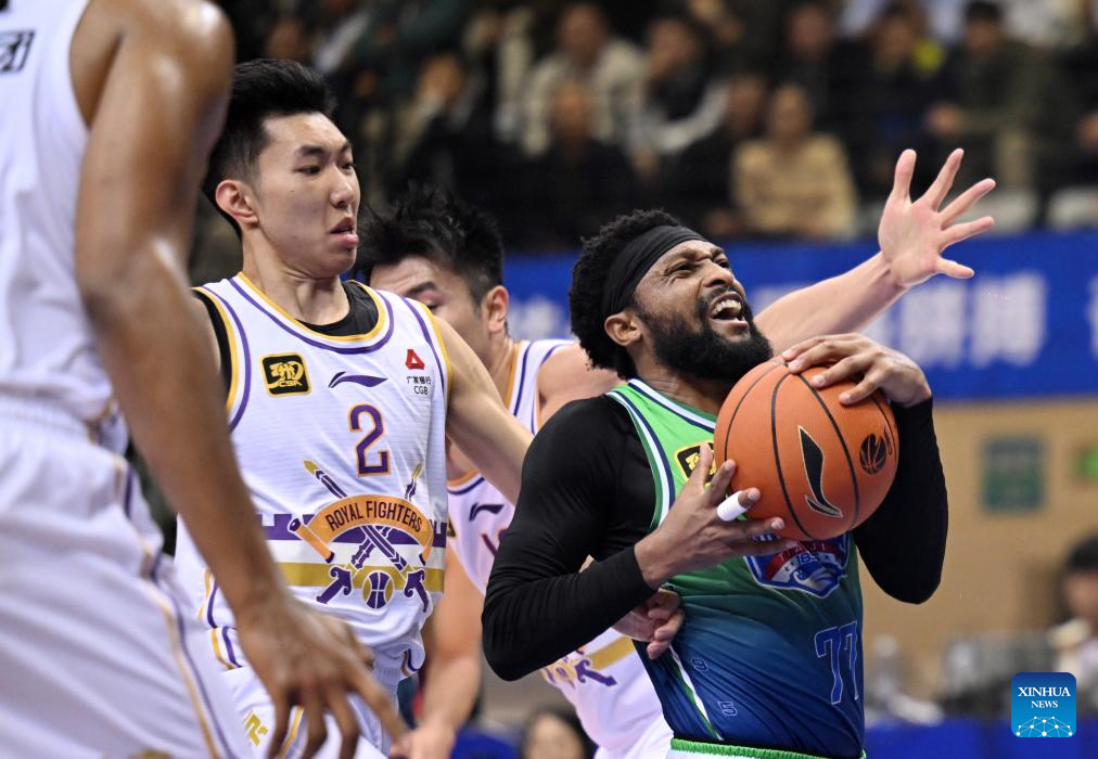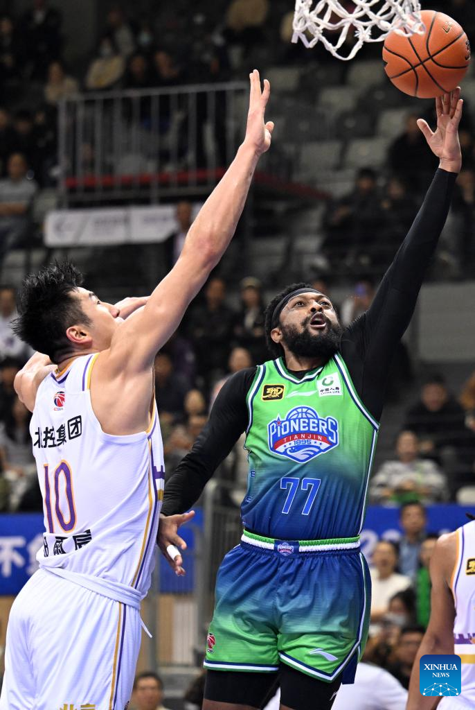 Marcus Lovett Jr. Javaughn (R) of Tianjin Pioneers goes for a basket during a match between Beijing Royal Fighters and Tianjin Pioneers at the 2024-2025 season of the Chinese Basketball Association (CBA) league in Tianjin, China, Oct. 29, 2024. (Xinhua/Zhao Zishuo)