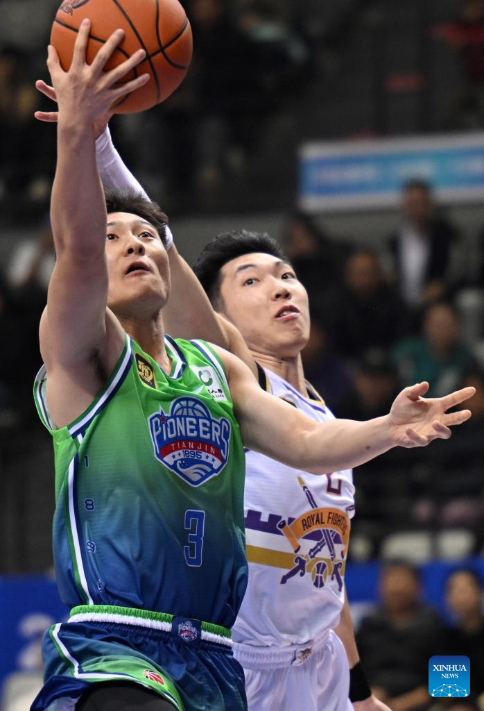 Gu Zeyu (L) of Tianjin Pioneers goes for a basket during a match between Beijing Royal Fighters and Tianjin Pioneers at the 2024-2025 season of the Chinese Basketball Association (CBA) league in Tianjin, China, Oct. 29, 2024. (Xinhua/Zhao Zishuo)