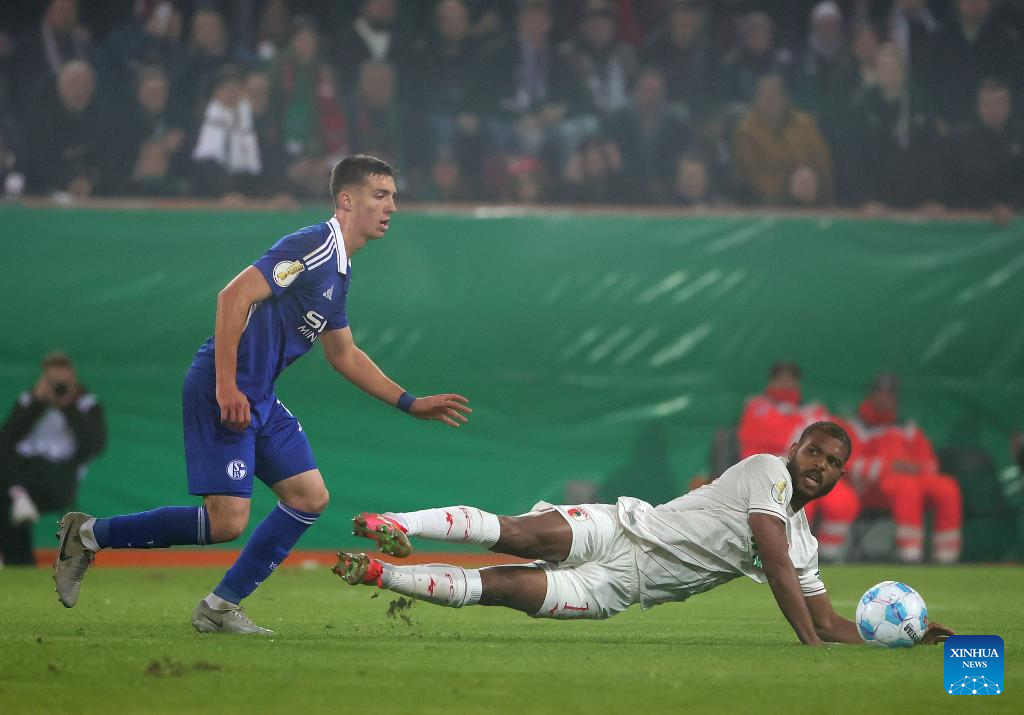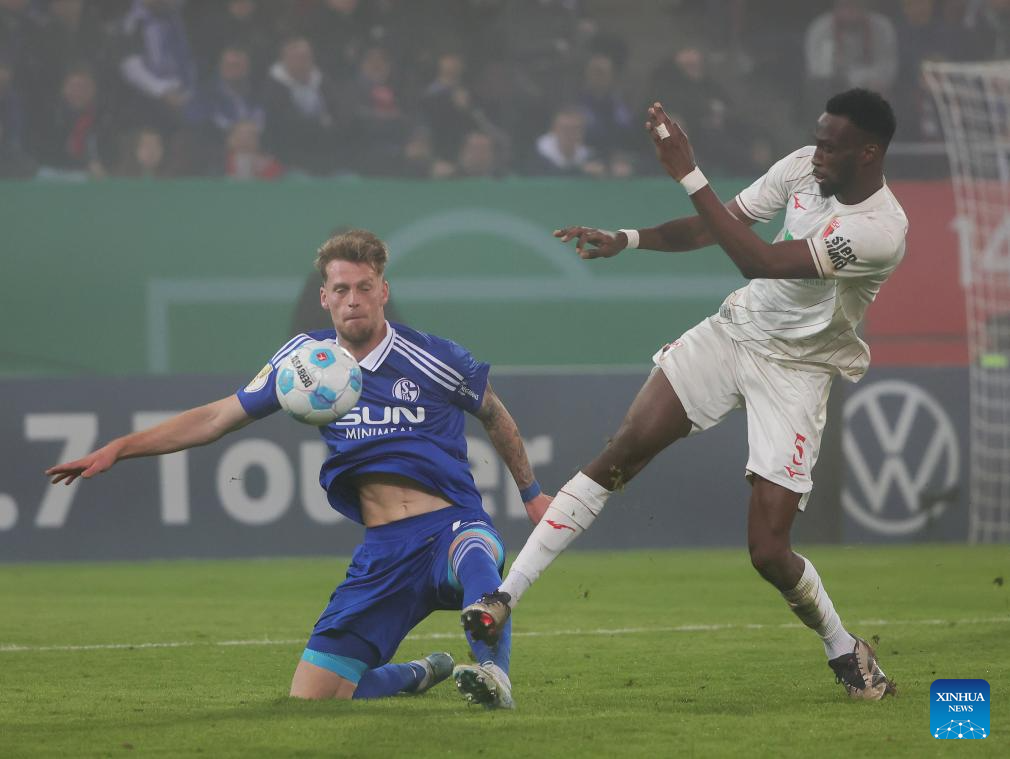 Chrislain Matsima (R) of FC Augsburg vies with Tim Schmidt of FC Schalke 04 during the German Cup football match between FC Augsburg and FC Schalke 04 in Augsburg, Germany, Oct. 29, 2024. (Photo by Philippe Ruiz/Xinhua)