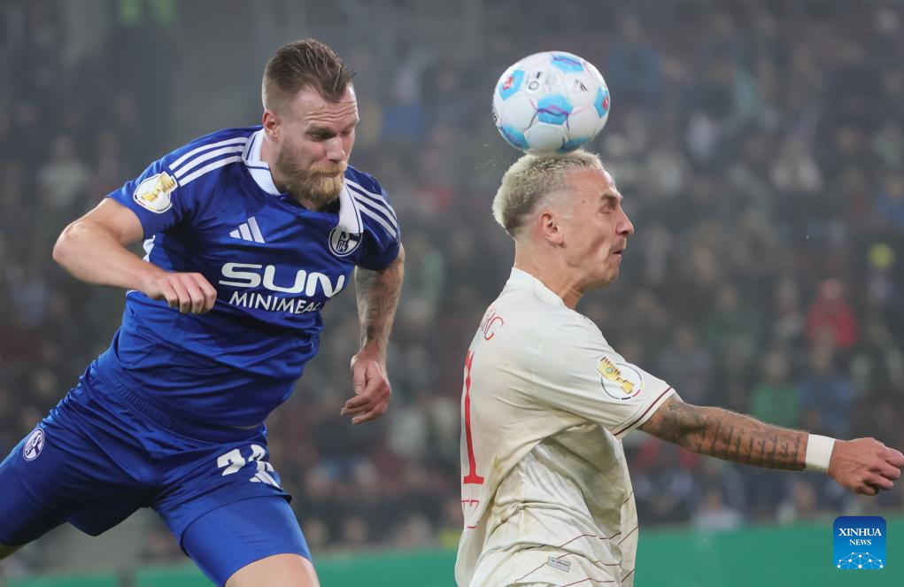 Philip Tietz (R) of FC Augsburg and Tomas Kalas of FC Schalke 04 vies for a header during the German Cup football match between FC Augsburg and FC Schalke 04 in Augsburg, Germany, Oct. 29, 2024. (Photo by Philippe Ruiz/Xinhua)