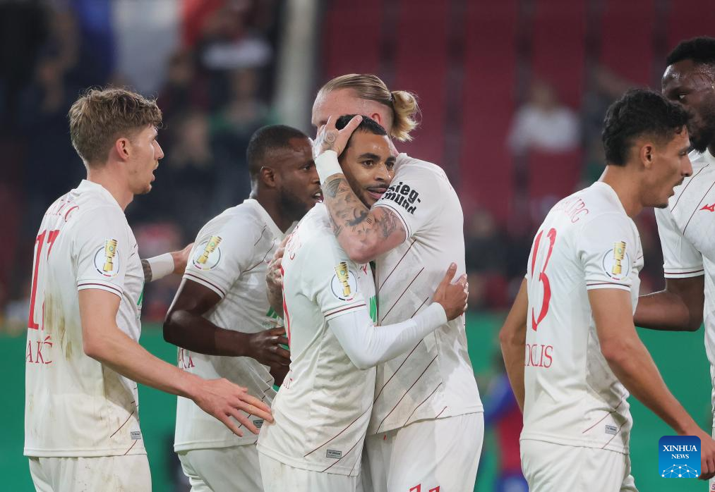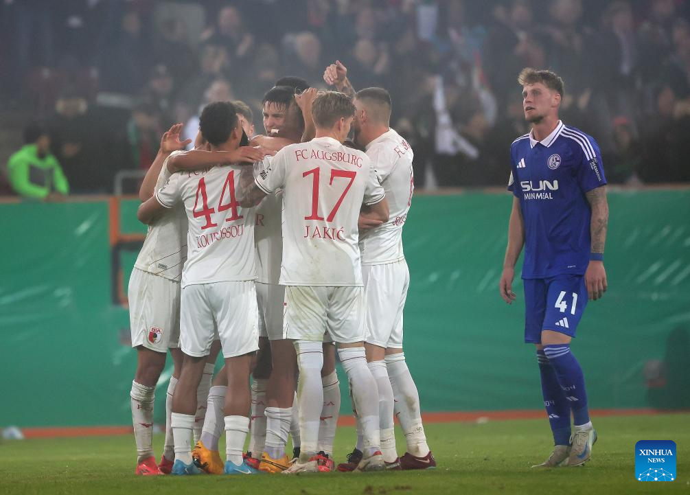 Players of FC Augsburg celebrate for a goal during the German Cup football match between FC Augsburg and FC Schalke 04 in Augsburg, Germany, Oct. 29, 2024. (Photo by Philippe Ruiz/Xinhua)