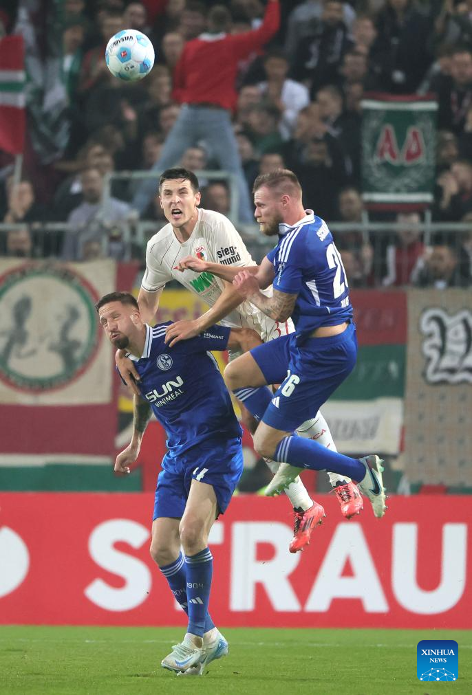 Keven Schlotterbeck (C) of FC Augsburg vies with Janik Bachmann (L) and Tomas Kalas (R) of FC Schalke 04 during the German Cup football match between FC Augsburg and FC Schalke 04 in Augsburg, Germany, Oct. 29, 2024. (Photo by Philippe Ruiz/Xinhua)
