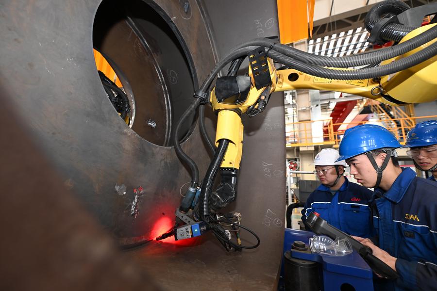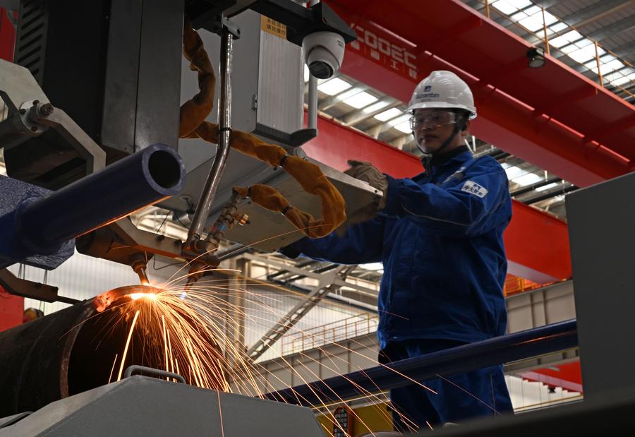 Staff members debug a digital plate-cutting machine at a pipeline workshop of an intelligent manufacturing base under China Offshore Oil Engineering Company in north China's Tianjin, on Oct. 30, 2024. (Xinhua/Zhao Zishuo)Staff members debug a welding robot at a pipeline workshop of an intelligent manufacturing base under China Offshore Oil Engineering Company in north China's Tianjin, on Oct. 30, 2024. (Xinhua/Zhao Zishuo)A staff member operates a digital intersecting line-cutting machine at a pipeline workshop of an intelligent manufacturing base under China Offshore Oil Engineering Company in north China's Tianjin, on Oct. 30, 2024. (Xinhua/Zhao Zishuo)Staff members debug a welding robot at a pipeline workshop of an intelligent manufacturing base under China Offshore Oil Engineering Company in north China's Tianjin, on Oct. 30, 2024. (Xinhua/Zhao Zishuo)A staff member maintains a smart welding machine at a pipeline workshop of an intelligent manufacturing base under China Offshore Oil Engineering Company in north China's Tianjin, on Oct. 30, 2024. (Xinhua/Zhao Zishuo)■