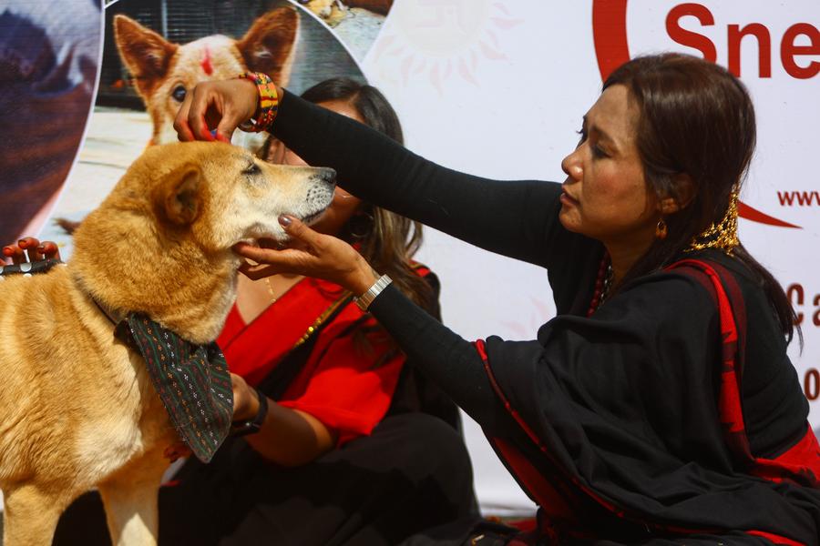 LALITPUR, Nepal, Nov. 1 (Xinhua) -- People worshiped and thanked dogs for their loyalty and services during the Hindu festival of Kukur Tihar in Lalitpur, Nepal.